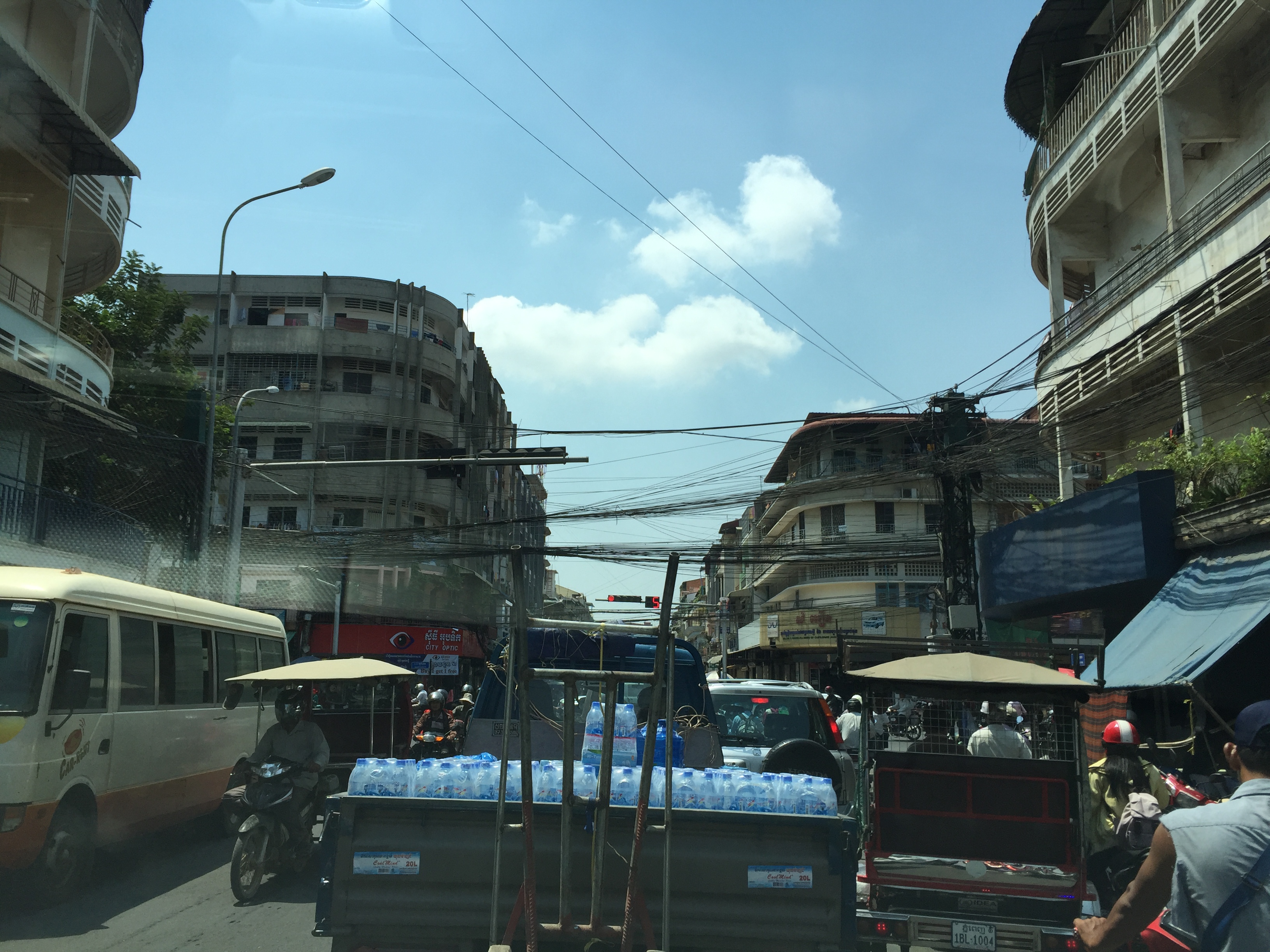Driving here reminds me of walking through a busy mall at Christmas, only a lot faster. There aren’t any lanes, you just maneuver however you can to wherever you need to be. That’s the roads in Cambodia with cars, trucks, people, and animals.