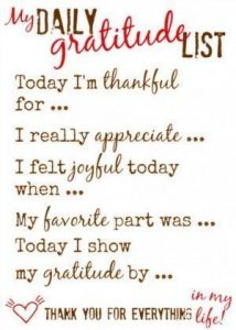 I challenge you to make a “Gratitude List”. Possible, make a new list every day or evening – a list of 3 things you are thankful for every day. It will amaze you the change that will happen in your attitude and experiences when you make a “Gratitude List.”