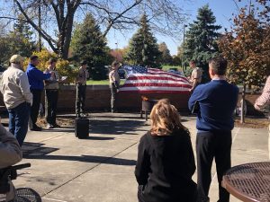 flag was unfurrowed and the group recited the Pledge of Allegiance. The color guard unit leader then recites a tribute to the Flag as on of the Boy Scouts cuts each stripe and places it in the fire.